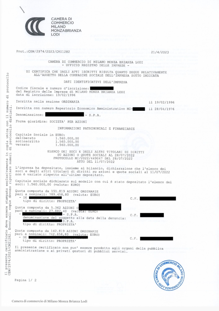 La compagine sociale (elenco dei soci) per le società di capitali, ad esclusione delle società quotate in Borsa e delle società cooperative; tale documento è disponibile a partire dall’anno 1994.