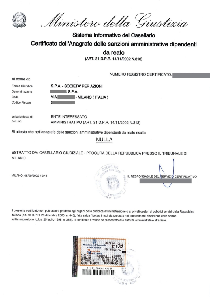 Il certificato derivanti da reato documenta i provvedimenti giudiziari che contestano a un ente un illecito amministrativo, nonché ogni altro atto giudiziario relativo alla contestazione dell’illecito, emesso nelle fasi e nei gradi successivi.